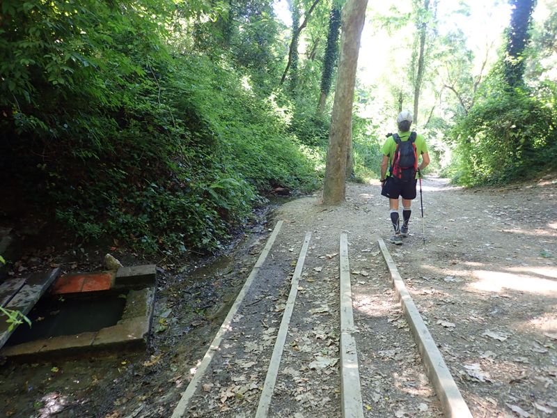 El camí planeja sota el vessant nord del turó de l’Espiganosa (completament urbanitzat) per un preciós corriol ombrívol que s’endinsa en un boscatge intens i on haurem d’estar atents d’agafar el camí correcte en un parell de cruïlles. La font de l’Espiganosa, restaurada l’any 2010, està envoltada de grans plataners en un entorn agradable. La font està força arranjada, amb un frontal de pedra d’on brolla l’aigua i una bassa a nivell de terra amb dos taulons de fusta que la travessa.
