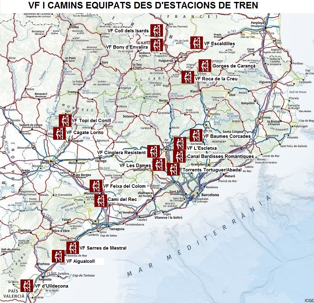 Us presentem una llista de vies ferrades (VF) i camins equipats que es poden fer des d’una estació de tren de casa nostra. És una llista més extensa que les ressenyes publicades en aquest bloc atès que hi consten també aquelles vies que al nostre parer es poden realitzar sortint i acabant en una estació de ferrocarril però que encara no hem realitzat.