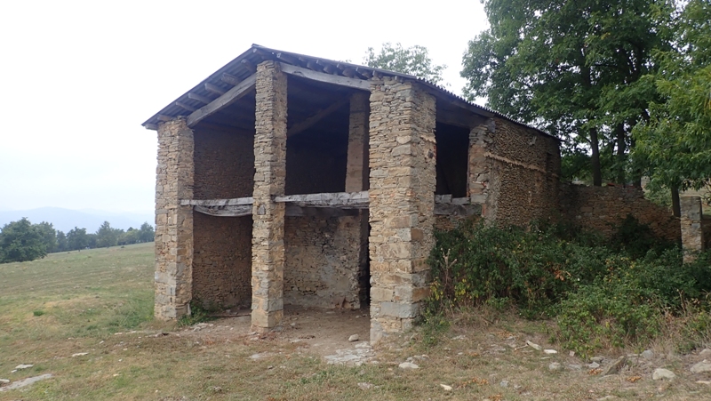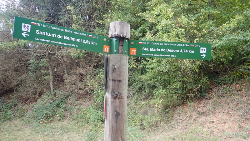 Assolim la masia del Bosquetell, abandonada i en ruïnes davant de la qual trobem una àmplia praderia. Uns metres més enllà trobem un trencall on es separen el camí que puja al cim del Bellmunt (a 2,5 km) seguint una mica més el GR-3, amb el que va al salt del Mir seguint el GR-151 Camí del Bisbe Oliba, sender aquest últim que no abandonarem fins a Sant Quirze. Cal encara un darrer esforç per acostar-nos al proper collet del Bosquetell.