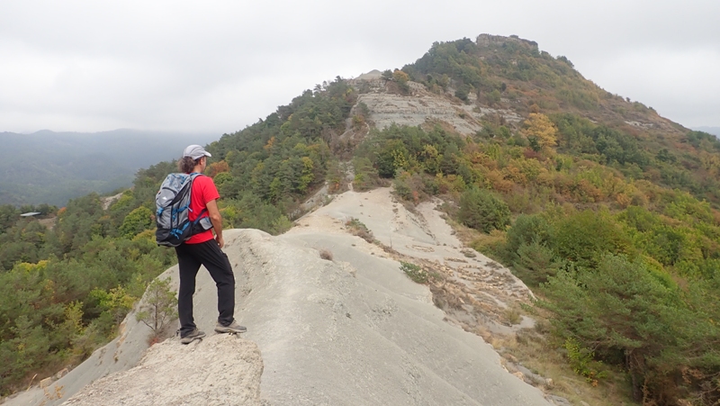 Traspassem el bell coll de la Mongia, una collada nua marcada per l’aflorament de margues grises que ja hem vist al collet del Bosquetell, i des d’on es pot observar amb claredat la serra de Bufadors al nord.