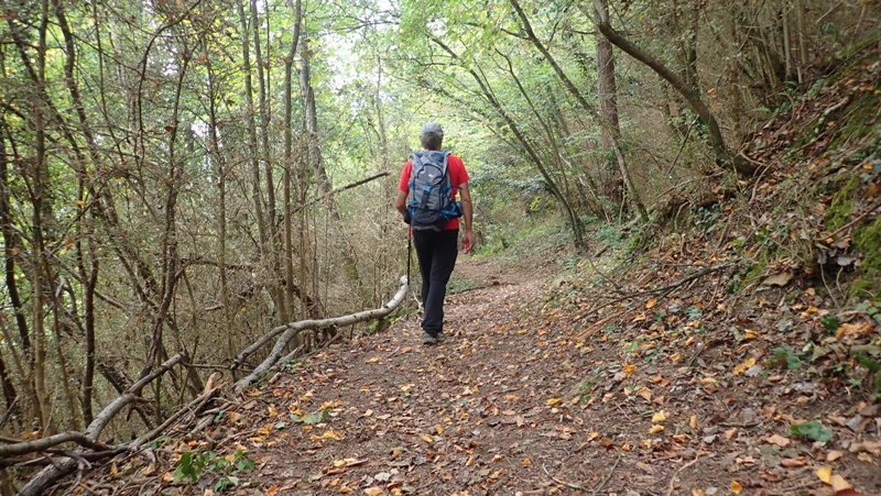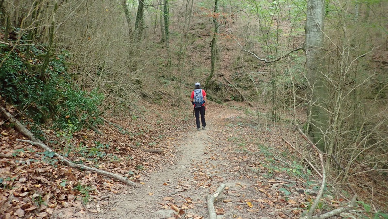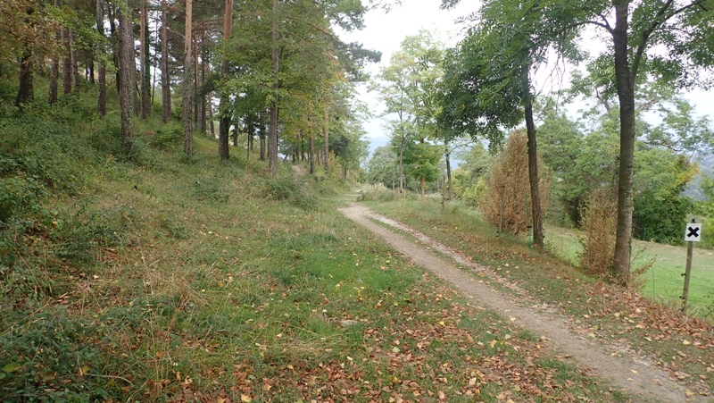 La baixada al castell de Montesquiu la fem bàsicament per pista seguint les marques del GR-151 i del PR C-129 que s’endinsen en la Solana del Castell, un alzinar amb castanyers aïllats.
