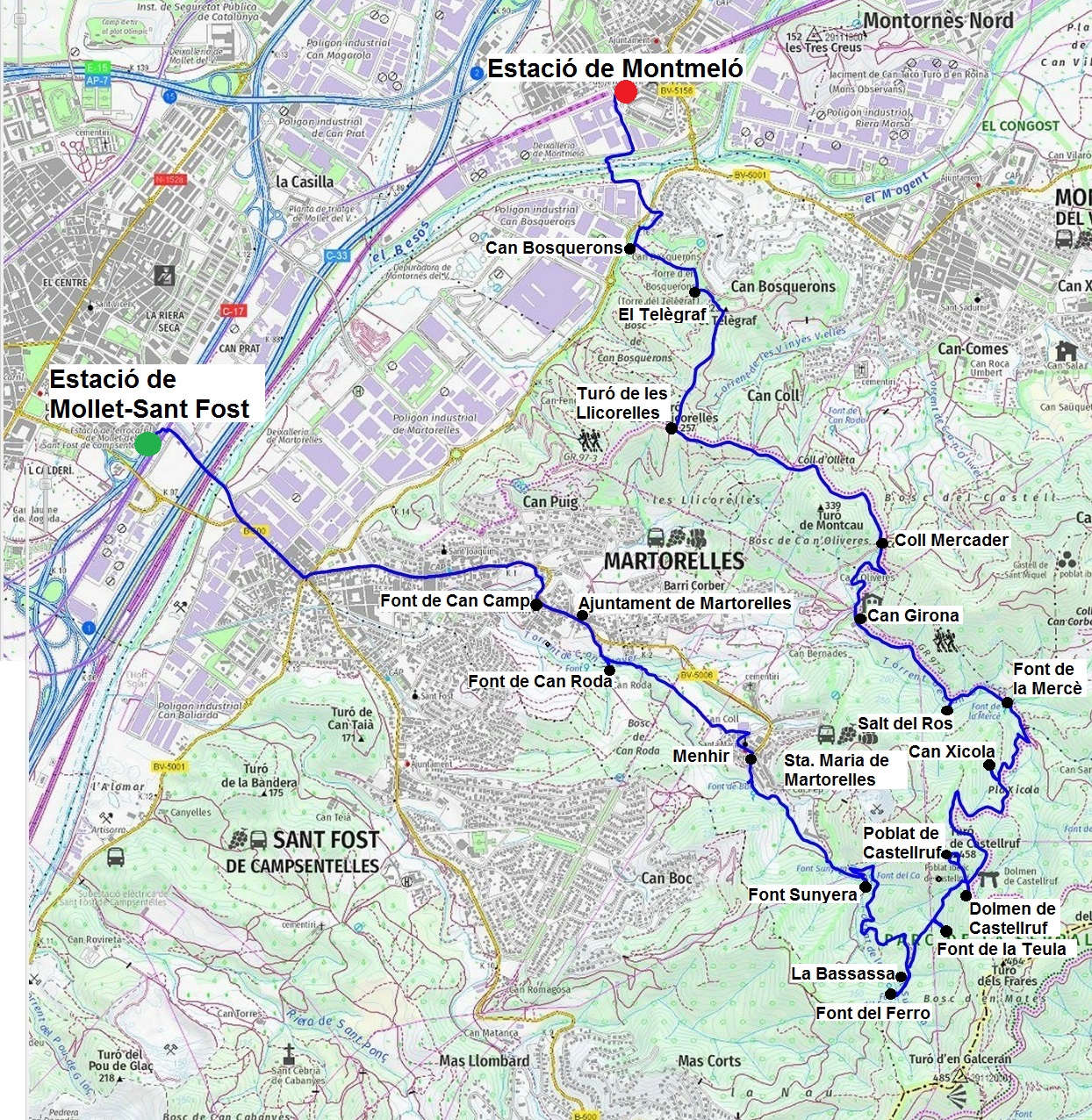 Tot i que sortim de Mollet i arribem a Montmeló, la travessa recorre bàsicament pels termes municipals de Martorelles, Santa Maria de Martorelles i Montornès del Vallès. El seu nucli és el SL C-120, un sender local que té el suggeridor nom de Les Fonts de Santa Maria de Martorelles. Les fonts seran les estrelles de l’itinerari, uns brolladors situats sovint en racons encisadors enmig d’una vegetació exuberant i que mereixen una visita. La ruta abalisada en visita les més importants, com la del Ferro, la de la Teula, la del Ca o de la Mercè. Però aquest itinerari també us acostarà a visitar-ne’n d’altres prou interessants i que no recorre el SL, com ara les fonts de Can Roda, de la Bassassa (toll) o de Can Camp. Així mateix coneixerem algunes infraestructures d’enginyeria hidràulica, sèquies i canals que si no estem a l’aguait passen camuflades en el territori. Coneixeu l’existència del Rec Gran?