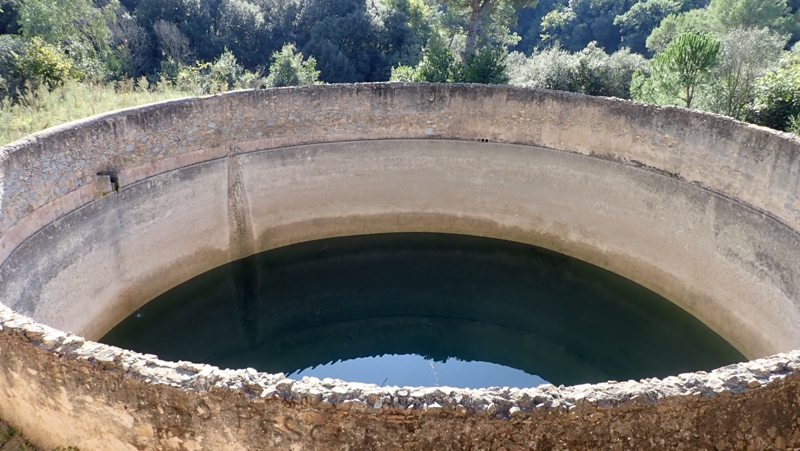 Més endavant, abans de Can Girona assolim la gran bassa circular de Can Girona (barana de fusta). Té 18 m de diàmetre, 10 de profunditat i capacitat per a 1.500 m3, suficients per a abastir Can Girona i els horts i conreus de tota la finca. Fins aquí arribava la sèquia que ve de la font de la Mercè. Si ens hem fixat pel camí haurem vist a mà esquerra la canalització en algun punt.