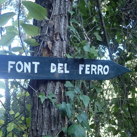Des de la font cal desfer les passes fins a la cruïlla anterior, situada a 180 m de la font. Un pal indicador ens ajuda a seguir pel camí correcte. Anem a la dreta caminant entre un agradable corriol emboscat fins al trencall de la font del Ferro (dreta).