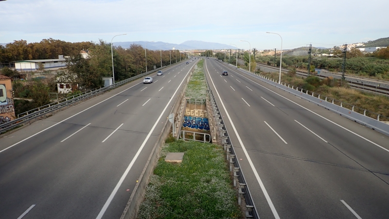 Un llarg pont de vianants creua d’un cop els sis carrils de l’AP-7, les vies del tren d’alta velocitat i el riu Besòs. Si teniu sort i coincidiu amb el pas d’un tren d’alta velocitat es poden fer interessants fotos amb aquests elements amb el Montseny com a teló de fons.