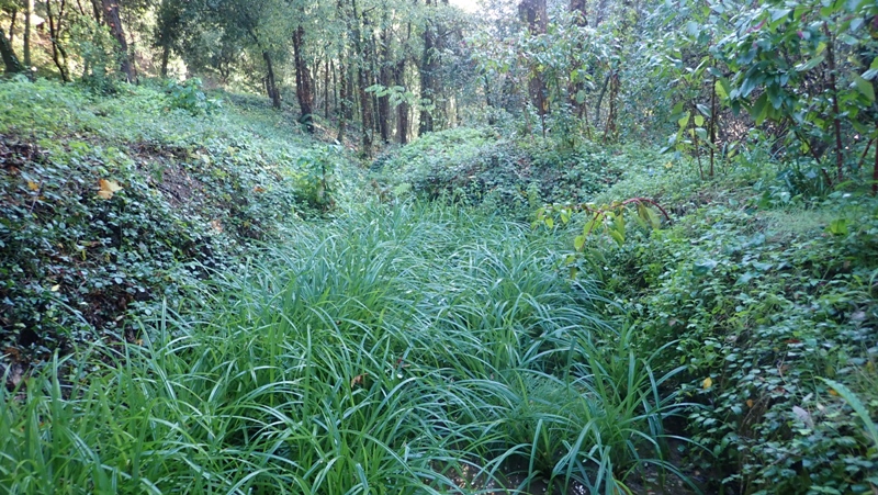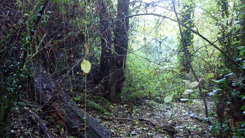 Situats de nou al coll, prenem el camí a l’esquerra seguint els indicadors dels senders GR-97.2 i SL C-120. Comencem a baixar per una pista que va pel llevant del turó de Castellruf i que travessa un bosc mixt d’alzines i roures. A la nostra dreta, entre la vegetació, tindrem bones vistes del turó de Sant Miquel amb la torre de l’homenatge ben visible al capdamunt sobresortint dels camps de vinyes i cirerers de Can Barbeta. El descens, a trams força inclinat, passa pels camps de conreus abandonats del Pla Xicola fins a arribar al fons de la vall del torrent de Can Gurri, un indret on la humitat i la vegetació profunda dominen el paisatge.