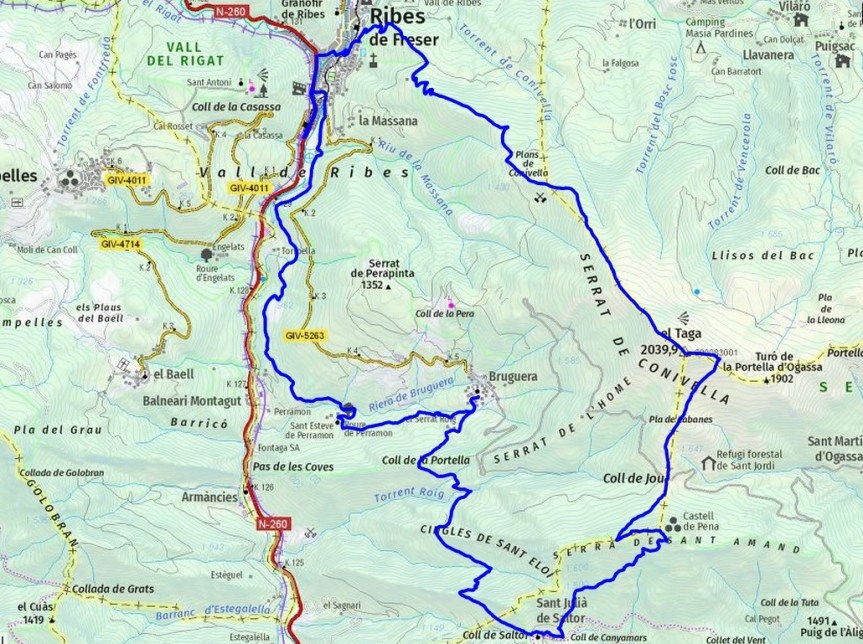 Exigent ruta circular que des l’estació de Ribes de Freser ens portarà a fer els cims del Taga i de Sant Amand, el primer un cim inclòs a la llista dels 100 Cims de la FEEC. De baixada del St. Amand la travessa baixa fins al llogarret de Sant Julià de Saltor, des d’on ens acostarem fins a Bruguera i finalment de retorn a Ribes de Freser per un camí que passa elevat sobre el riu Freser.