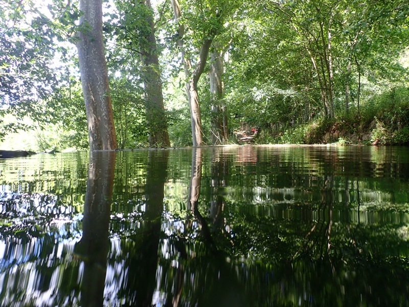Plataneda: Tot just es creua la carretera a Olzinelles pel pont de Ca l’Alzina Vell entrem en una zona on el bosc de ribera ha estat substituït per una plantació de plàtans, arbre de creixement ràpid però de fusta de mala qualitat.
