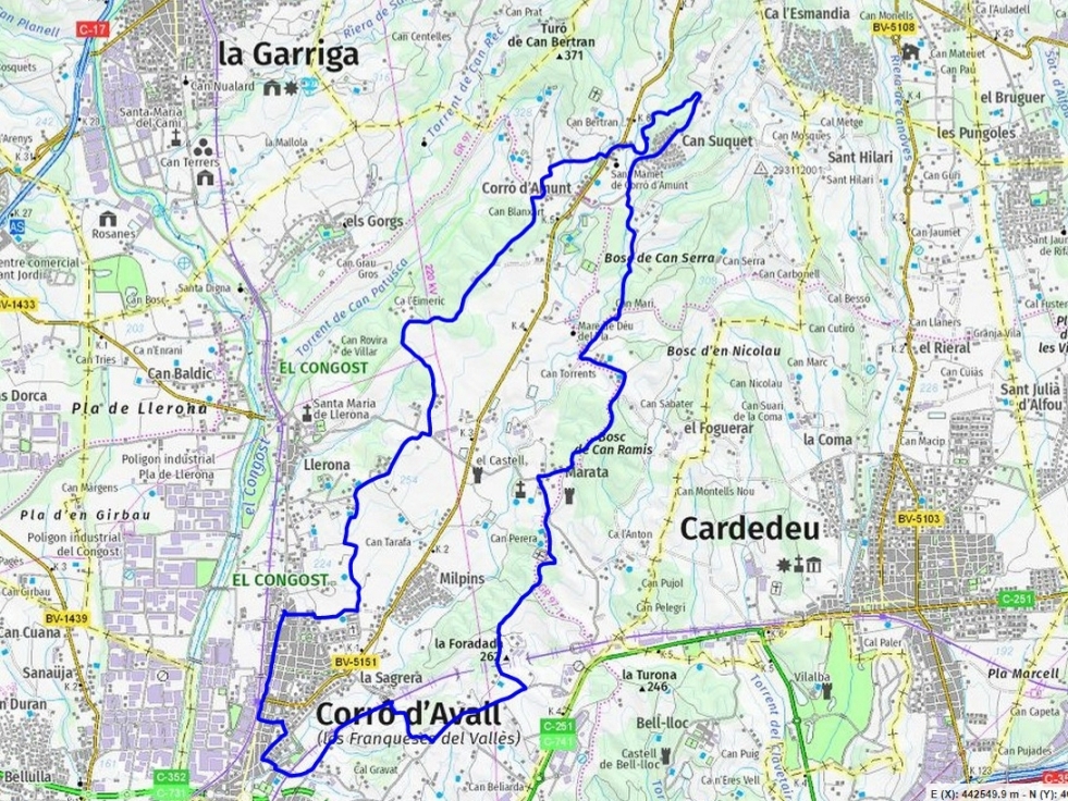 És una ruta fàcil i planera, amb escassos desnivells, que ens portarà a visitar tres dels quatre pobles històrics que conformen el municipi: Marata, Corró d’Avall i Corró d’Amunt (només zona de Can Suquet). Llerona, el quart, no el trepitjarem atès que es troba situat a tocar del riu Congost entre Corró d’Avall i La Garriga.