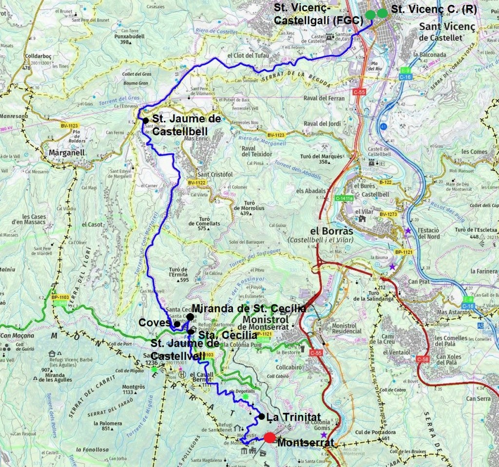 Per fer-ho podrem sortir des de qualsevol de les dues estacions de les que gaudeix Sant Vicenç de Castellet (Bages), bé des de la dels Ferrocarrils Catalans (Sant Vicenç-Castellgalí) o bé des de la de Rodalies (Sant Vicenç de Castellet). La ruta resulta en general força interessant i la podem utilitzar com una ruta més per a pujar al Monestir de les diferents opcions que us oferim al web sota el títol de Recull de pujades a Montserrat des d’estacions de ferrocarril properes.
