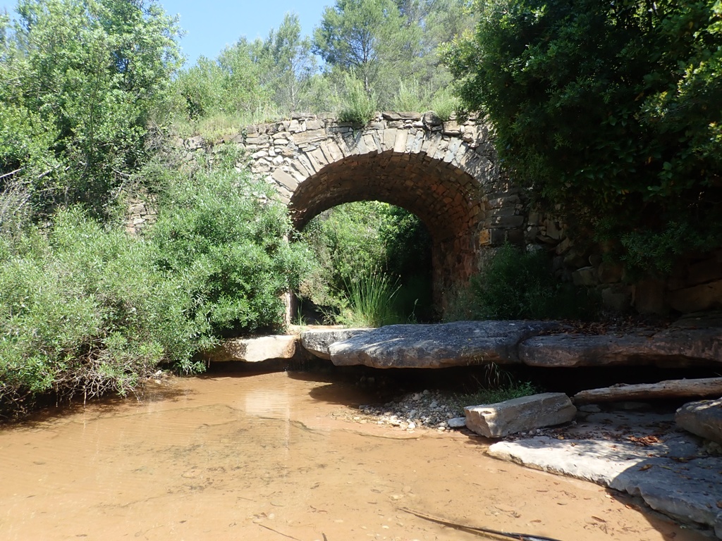 2. Pont del Solei Vell (s. XVIII-XX): També anomenat pont del Solell de la Barraca. Està mig engolit per la vegetació. Està format per una volta d’un sol ull fet per de pedra seca, amb les dovelles de l’arc posades verticalment. Construït per portar les pedres pel moli de moldre olives de cal Josep.