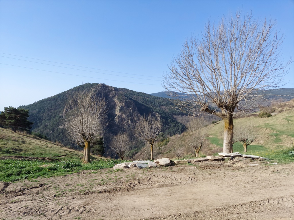Riu de Serrat: Es creua un pont sobre la riera i se segueix el camí d’accés a Vilardell, tot i que de seguida es pren un corriol a la dreta (senyals). El camí, força emboscat, va sobre camps de cultiu. Més endavant, deixem enrere l’enrunat mas de Can Cerdà.