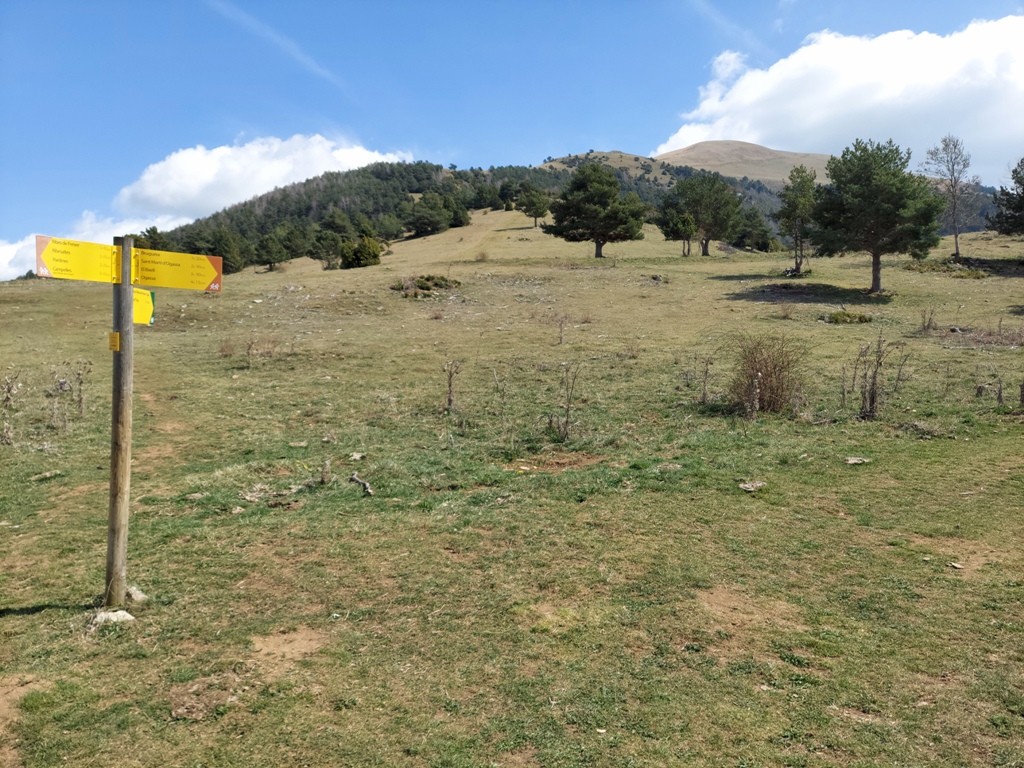 El camí fins al coll de la Pera pot resultar confús si seguim estrictament els senyals grocs d’Itinerànnia. Les marques ens conviden a abandonar la còmoda pista en un punt on tenim davant nostre, encara a 200 m, les antenes de Ca la Xeca. El sender gira a la dreta pel mig de prats. Costa de seguir les marques fins a trobar un corriol emboscat.