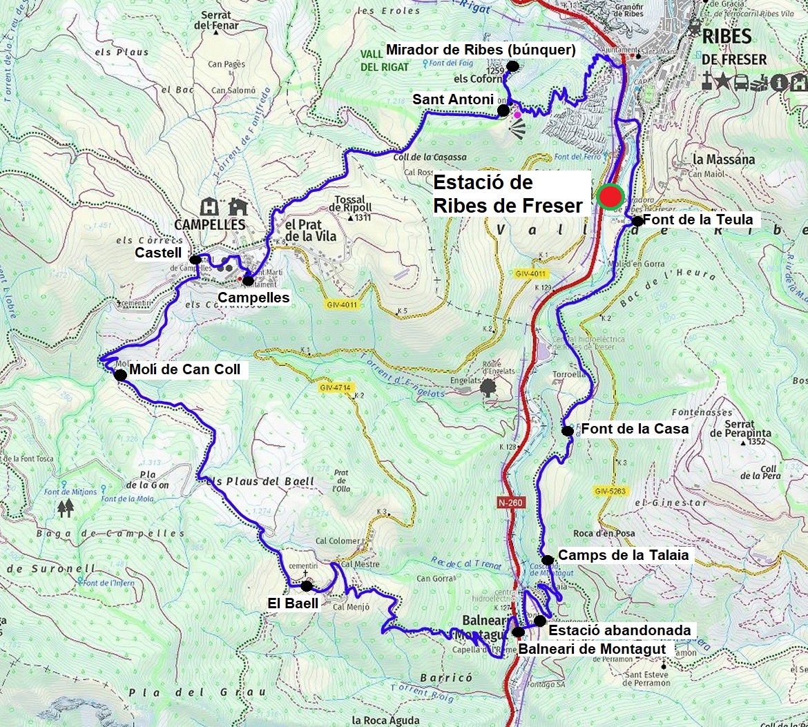 Ruta circular que des de l’estació de Ribes de Freser us acosta de nou al sud de la vall de Ribes resseguint en aquesta ocasió, l’ala de ponent de la Ruta ST241, aquella que des del balneari de Montagut passa pel Baell i Campelles.