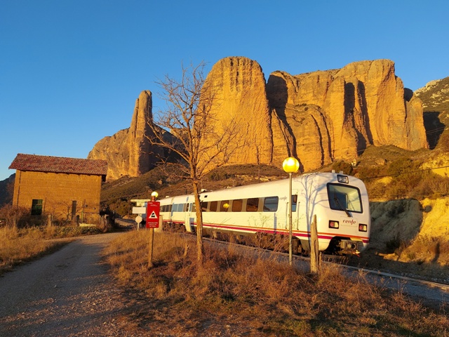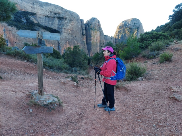 La sortida la fem des de l’estació de Riglos, un baixador de la línia de tren que uneix Saragossa, Osca i Canfranc, més coneguda com el Canfranero. L’estació està mig abandonada i situada a 15 minuts a peu del poble. Per arribar-hi cal seguir en tot moment el GR-1 per una pista cimentada en ascens que ens ofereix enormes panoràmiques dels Mallos rere grans oliveres centenàries.