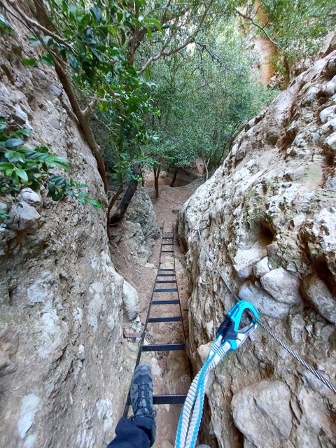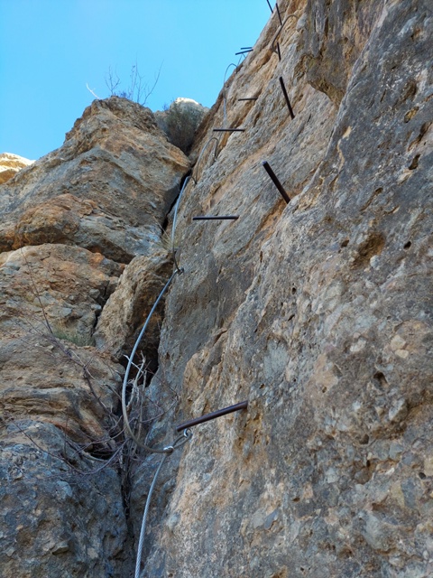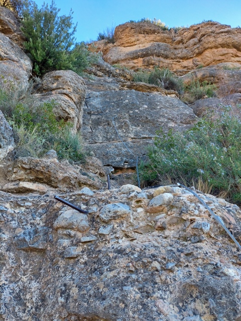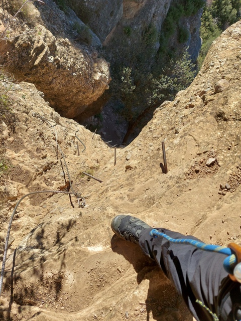 – Baixada pel Camí Equipat Peña Don Justo (K1). Un cop al Mirador de los Buitres no us traieu l’equipament atès que encara us serà útil a la baixada. El descens és tant o més interessant que la pujada. Baixarem entre un sublim paisatge entre agulles seguint un camí equipat, fàcil, però a estones aeri. Durant el descens pronunciat del corriol trobarem diverses cordes que faciliten la baixada per agafar-se, no hi ha ràpels ni res semblant. El més característic és un petit pont tibetà sobre una cadena d’un parell de metres de longitud. Més avall, una escala de ferro encaixonada entre blocs de pedra finalitza la part equipada.
