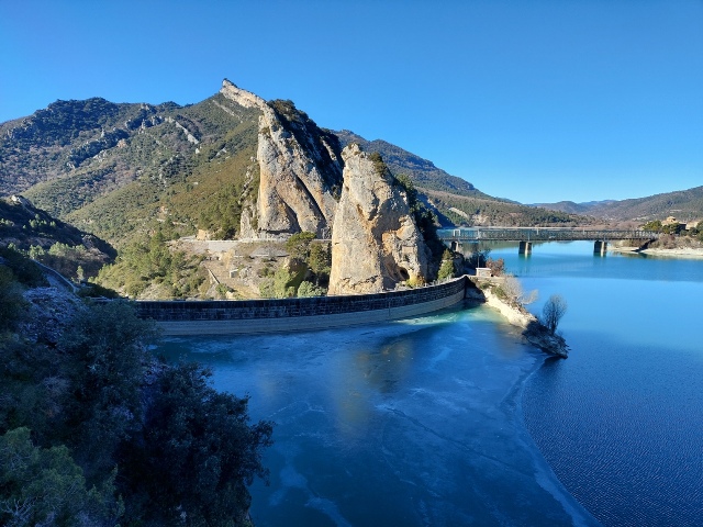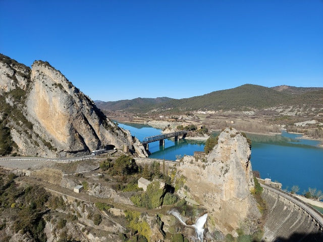 – Pont de ferro sobre el pantà. Caminem sobre un pont de ferro bastit inicialment per al Canfranero. La construcció del pantà va obligar a pujar el nivell de les vies per evitar la seva inundació i a fer un segon pont de ferro (1910-1912), que és el que podem veure al sud (dreta).