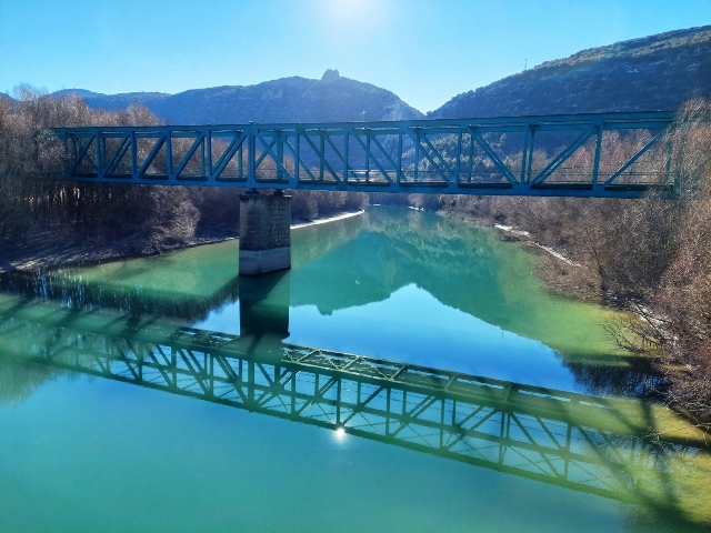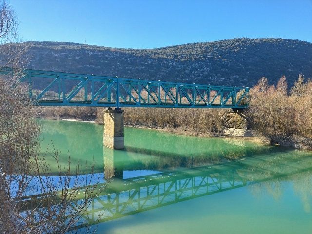 – Pont de ferro sobre el pantà. Caminem sobre un pont de ferro bastit inicialment per al Canfranero. La construcció del pantà va obligar a pujar el nivell de les vies per evitar la seva inundació i a fer un segon pont de ferro (1910-1912), que és el que podem veure al sud (dreta).