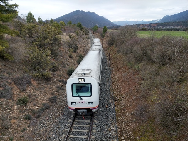 Caldearenas-Aquilué (Canfranero). L’estació, a tocar del poble, es va inaugurar el 1893 quan va entrar en funcionament el tram Osca-Jaca. Entre els anys 2013 i 2019 Renfe va deixar de donar servei a l’estació. En la represa, però, només hi té parada facultativa. Això implica el tren no s’hi atura si no avisem. Per tant, dalt del tren, hem de fer saber a l’interventor l’estació a la que volem baixar. Quan estiguem esperant un tren en una parada facultativa, haurem de fer un avís ben visible al conductor perquè pari i ens reculli. Als horaris de Renfe apareix una (F) per indicar aquest tipus d’estacions.